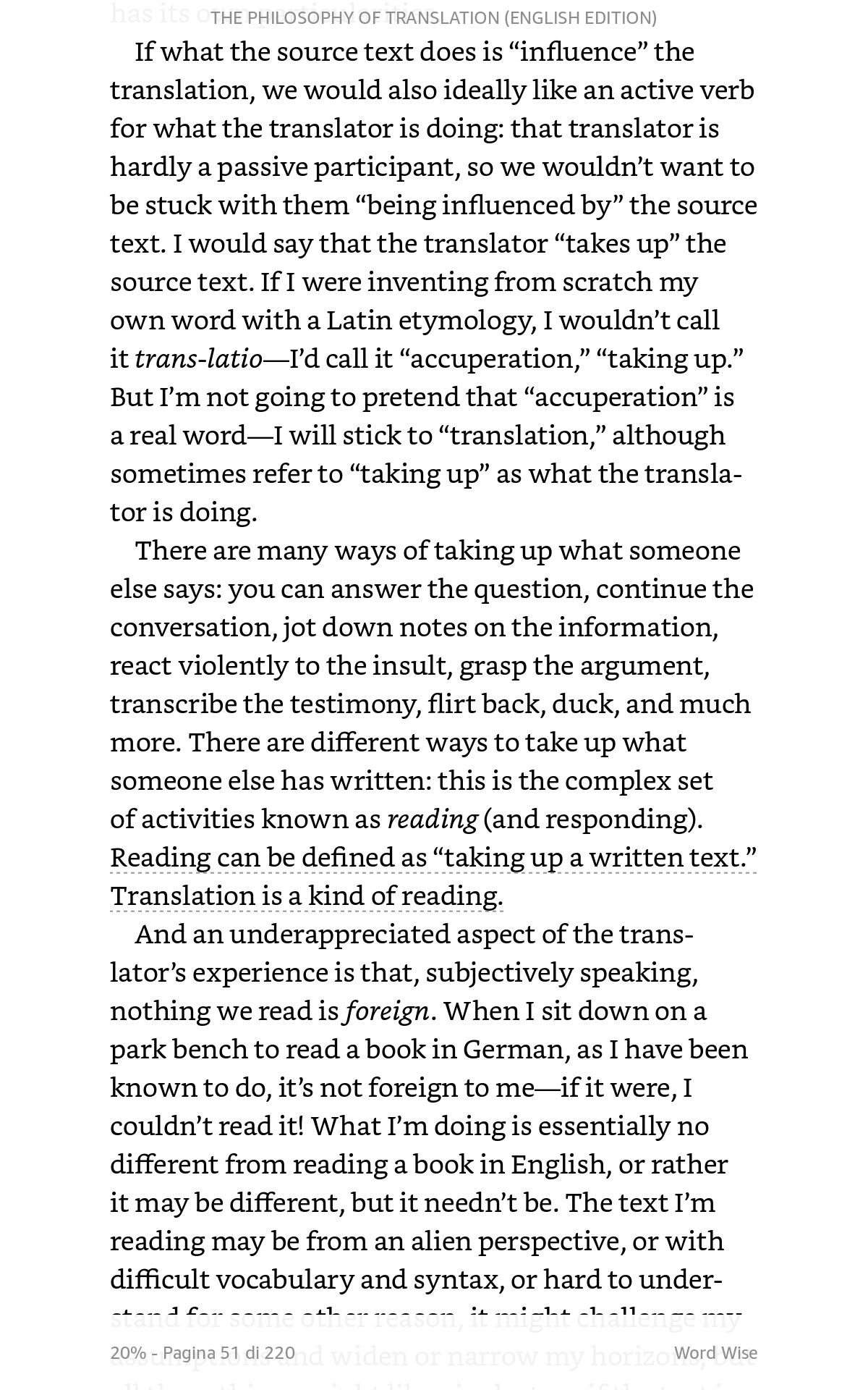 L’ho notato ad agosto a Berlino (dove mi trovavo per la prima volta, di passaggio), trascinato in Friedrichstraße per avere un assaggio dell’enorme libreria su cinque piani – ma non solo libreria – del Dussmann KulturKaufhaus. Nella sezione nonfiction dei libri in lingua inglese ero stato colpito proprio da questo titolo, per ovvi motivi professionali. Ed ero lì lì per prenderlo, ma considerazioni di peso – uno zaino già impegnativo di suo – alla fine mi hanno fatto desistere. Mi ero comunque ripromesso di tenerlo a mente per i futuri acquisti online in formato ebook. Così ieri, san Girolamo e giornata internazionale della traduzione, dopo aver letto e scaricato l’estratto gratuito per Kindle, ho rimediato al mancato acquisto berlinese. Con piena soddisfazione, per il momento.